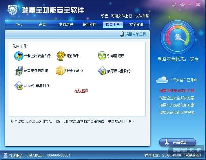 说明:在线服务不应该显示在这里,而是应该显示在瑞星工具当中