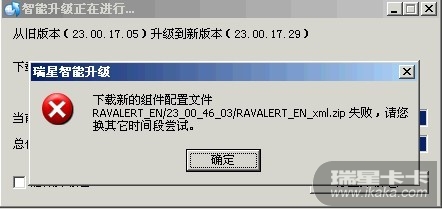 下载新的组件配置文件RAVALERT_EN/23_00_46_J3/RAVALERT_EN_XML.ZIP失败,请您换其他时间段尝试。有时候在某些客户端上提示失败的是其他的文件我尝试了很多论坛中的办法都不行。难道真的要在客户端逐台手动升级吗?摆脱救救我!!!