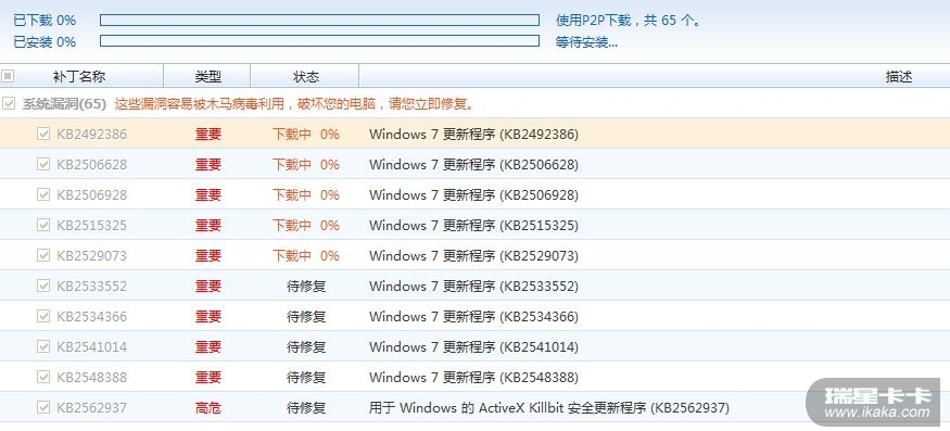 为什么我的瑞星安全助手在提示了我的电脑存在系统漏洞后,修复时显示下载中0%,一点进度也没有呢?