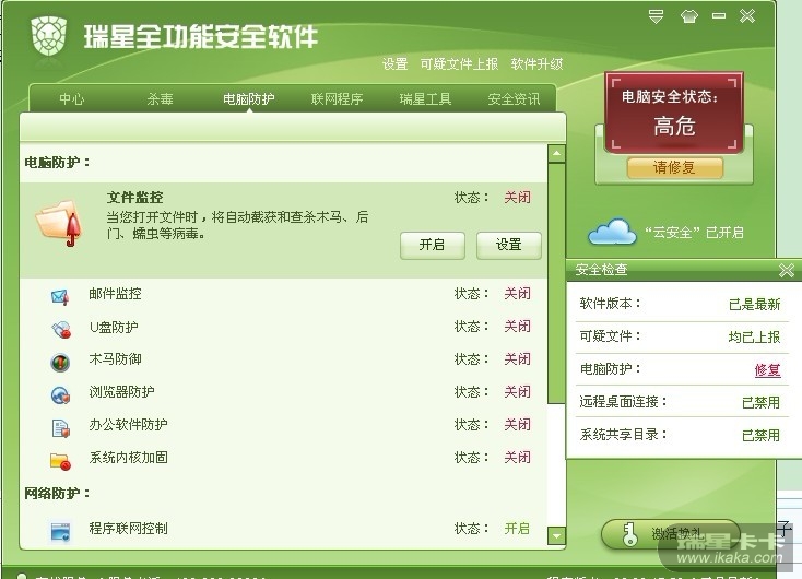 最近出了点小问题,就是电脑监控一直处于关闭状态,包括文件监控、邮件监控等均无法打开。