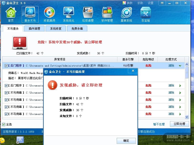 2、查杀完毕时双击提示条,返回主界面杀毒完毕时的结果提示,同时退出提示条(因为此时提示条已经无用处了),这时,最小化时不要再回到提示条了。