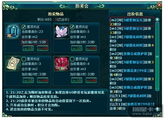 秒结束,并没有其他玩家再次对该战利品加价为止。竞拍使用玩家积分,只有成功兑换时,积分才会扣除。