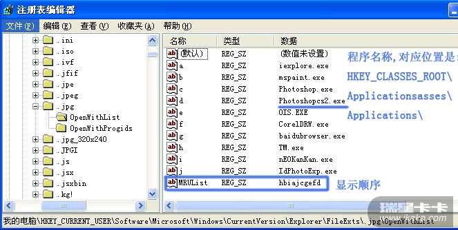 在.jpg项下面的OpenWithList中,可以按顺序新建一个字符串(比如显示的是abcd,那么可以新建一个e的字符串,然后填入程序名),然后在MRUList中增加即可(比如,原来MRUList中只有abcd,新建了一个e之后,在MRUList中,就应该也增加一个:abcde)。
