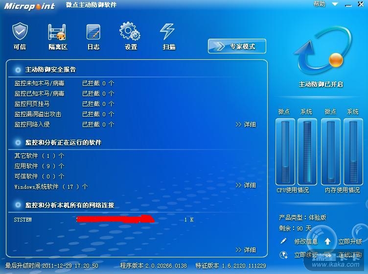 3.软件授权:瑞星从2011年3月18日宣布旗下个人产品全部免费微 点免费试用90天,但网上有90天循环试用工具,还可以申请一年预升级可以说是变向免费了(二):使用过程