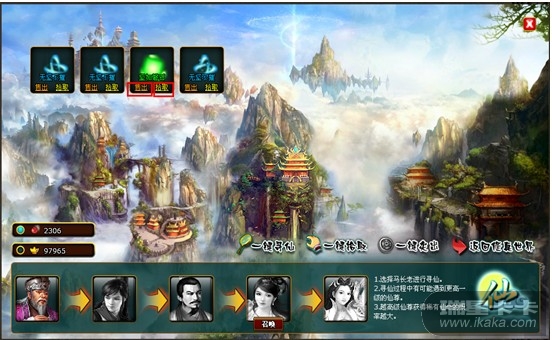玩家可进入寻仙场景寻访仙人获得仙命。寻仙场景中有5位仙人,从左至右分别为1—5级。仙人的级别越高,获取高品质仙命的几率越大。