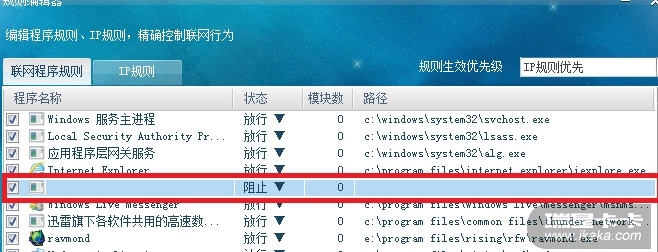 如上图,设定两条矛盾规则,放行在上,禁止在下,但不勾选放行的那一条,只让禁止的生效,下图是效果: