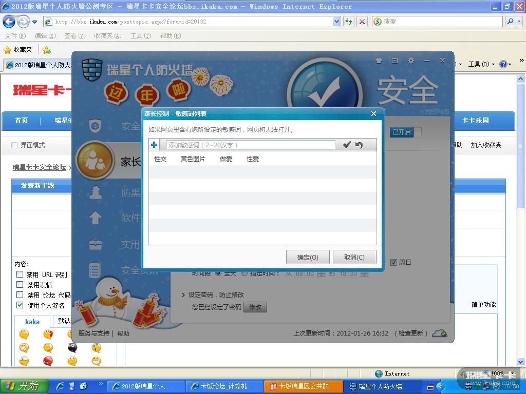 启用敏感词,无法访问卡饭的“国内杀毒软件讨论区”及其下的各子版块。