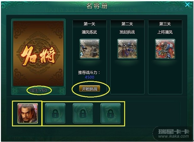 打开‘名将册’界面,选择某位英雄,点击开始挑战;