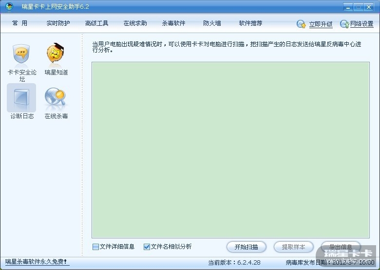 5.增加卡卡的诊断功能(只不过卡卡的诊断真的不好,希望安全助手能够加强,然后上传到瑞星安全论坛的”反病毒、反流氓软件讨论区“,还要上传文件诊所和云安全监测。。。。地址:http://bbs.ikaka.com/showforum-28.aspx