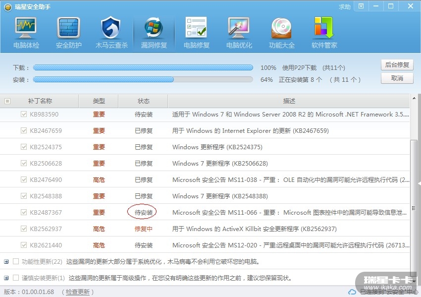 说明:在等待安装补丁的时候,我觉得应把“待安装”修改为“等待安装”的字样