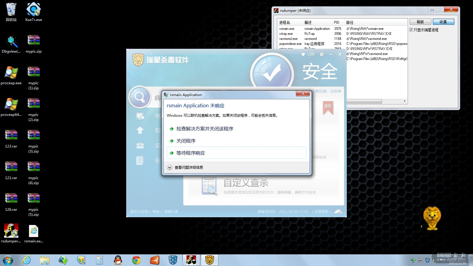 我又收集了一些dmp文件.触发流程,RFW断网,打开RAV主程序查毒,马上点击终止,多点几次就不响应了,整个过程要求云状态处于查询中