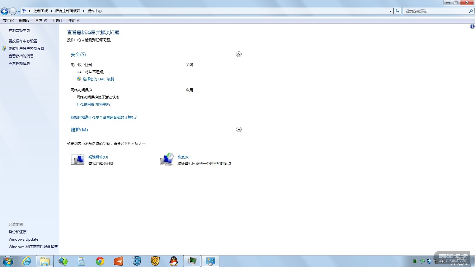 登陆成功后操作中心首先显示的是上图,没有杀软和防火墙等的消息,然后等待几分钟后是