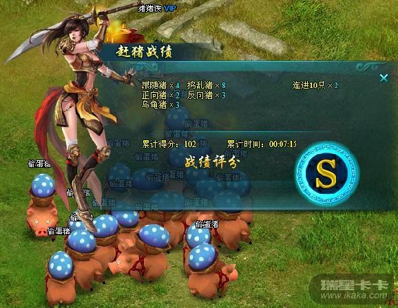 在副本时间内,玩家把副本内的猪赶进指定区域(猪圈),根据猪的种类、数量、连进次数进行得分统计。不同的得分段,刷出不同数量、不同成长的宠物。