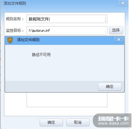 你没有看清楚我说的,我说的是盘符。比如,我要防atuo病毒。写一个这样的规则?:\autorun.inf他会提示路径错误。说明盘符不能用通配符。