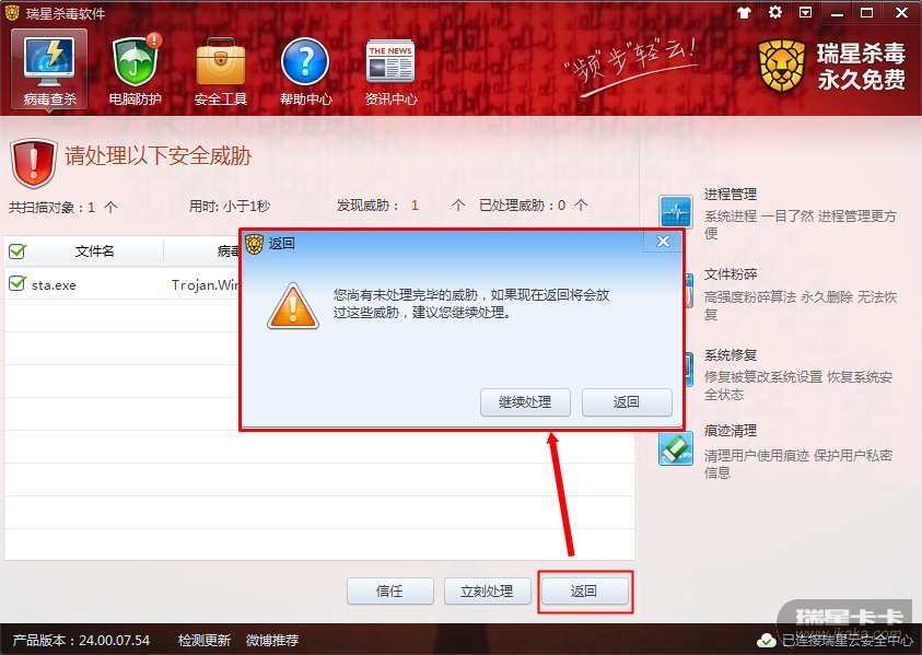 样本不是重点,是在扫出病毒但是没有清除的时候点击界面右上角的关闭,然后软件没有弹窗提示就直接退出了。应该像点返回按钮的时候一样弹窗提示有威胁尚未处理,语文不好,不知道说清楚没有
