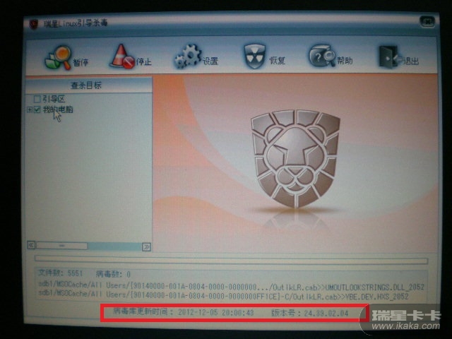 重启。U盘引导,可以执行Linux下杀毒。病毒库是2012-12-05的。