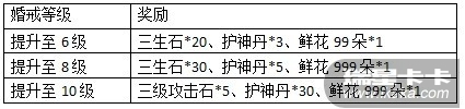 活动期间,举办豪华婚礼将进行打折,玩家只需999元宝,即可举办豪华婚礼。只需288元宝即可生死结拜。同时,在活动期间,将婚戒等级提升至指定级别,夫妻双方还可获得以下额外的奖励哦。