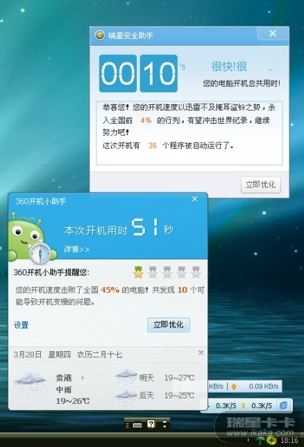 先骂一下快播软件!今天我装快播,突然间就多了美女聊天、视频搜索、百度工具栏、百度地址栏还有360安全卫士,捆绑的真够多的! 然后开机慢得要命。不过开了机,我却发现瑞星安全助手的开机时间与360安全卫士的开机时间不同,360是51秒,瑞星安全助手是09秒,09秒是不可能的。360我已经删了,所以版本号不记得了,大概是最新的,瑞星安全助手的是01.00.02.39。请工程师解决这个问题。谢谢。