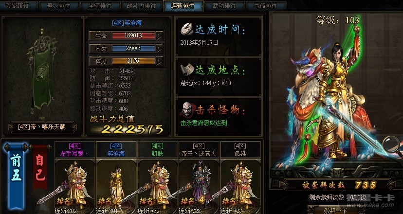 这张是我5月15号发的 那时候是102级打79的怪 上连斩排行 到现在没人管 再发张更坑的