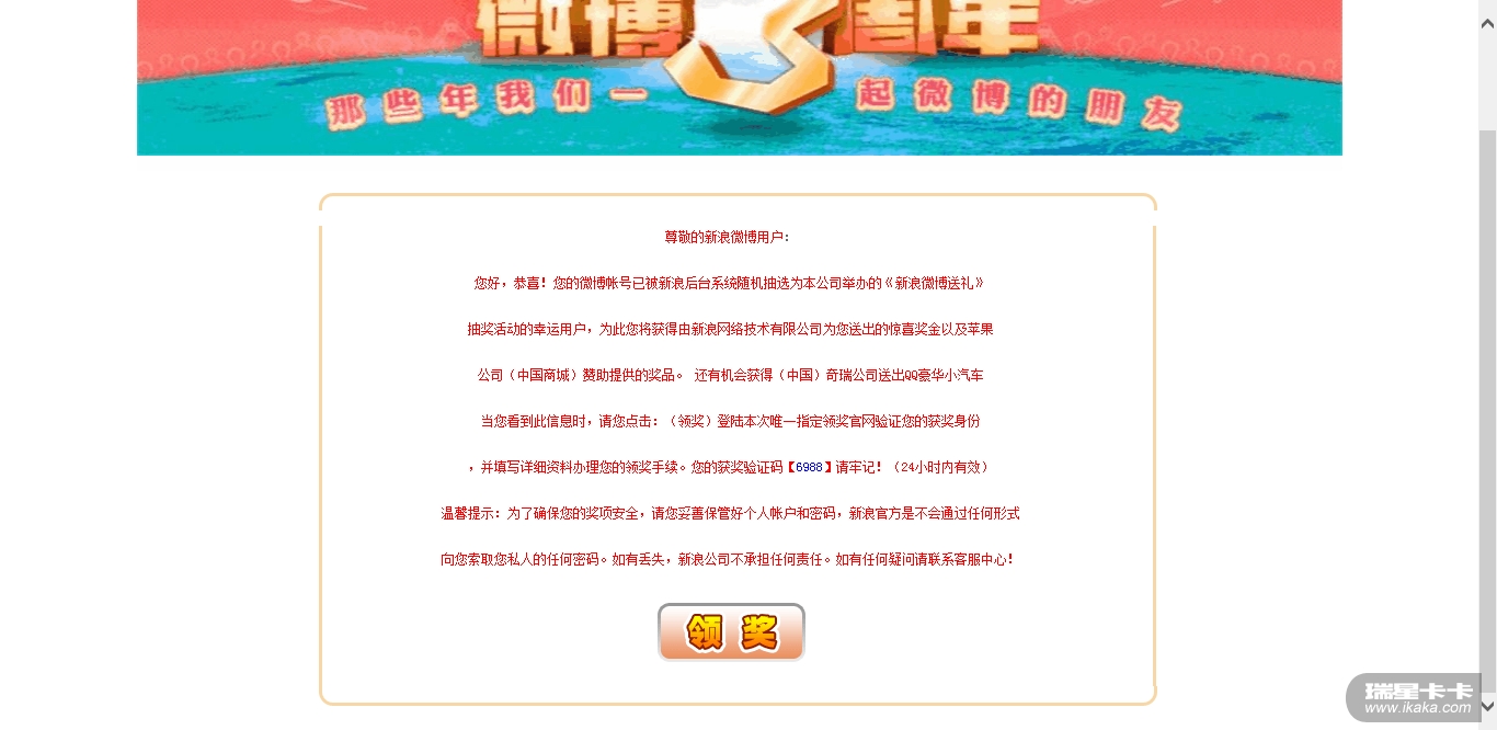 该网站仿冒新浪官方周年活动进行欺诈