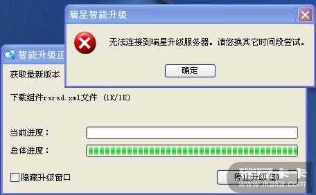 已连续三天无法升级瑞星杀毒软件,每次都在“下载组件rsrsd.xml文件 (1k/1k) ”时弹出“无法连接到瑞星升级服务器,请您换其它时间段尝试”。但今天可以升级卡卡和防火墙。请问如何解决?