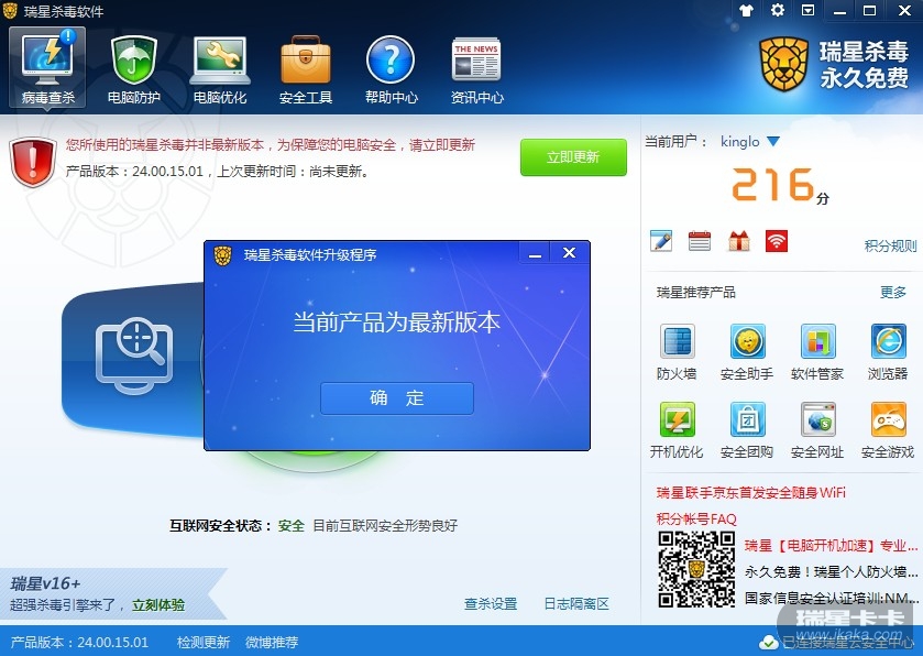 回复: 瑞星v16+无法更新到最新版,手动点击更新没反应老提示已是最新版
