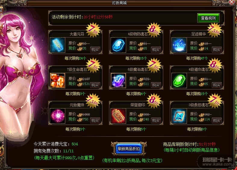 活动介绍:1、此为消费类活动,定时可开放。2、商城中的商品折扣率可以刷新,每个物品的折扣刷新后随机出现1至8折的折扣价格。刷新次数越多,越容易刷出低折扣。3、每天一次免费刷新次数,其实可在商城的积分商城中购买券券通道具进行刷新,最后可使用元宝刷新,每次3元宝。(优先扣道具)4、活动期间,每消费满500元宝可获得一次免费刷新机会。5、刷新时,只刷新商品的折扣,商品库不会变。6、当玩家购买一次商品后,当前商品信息不改变,每次刷新后每件商品有限购数量。限制数量在下次刷新后会重置。7、商品库每2个小时自动刷新一次。用户系统信息:Mozilla/5.0 (Windows NT 6.1; WOW64; Trident/7.0; rv:11.0) like Gecko