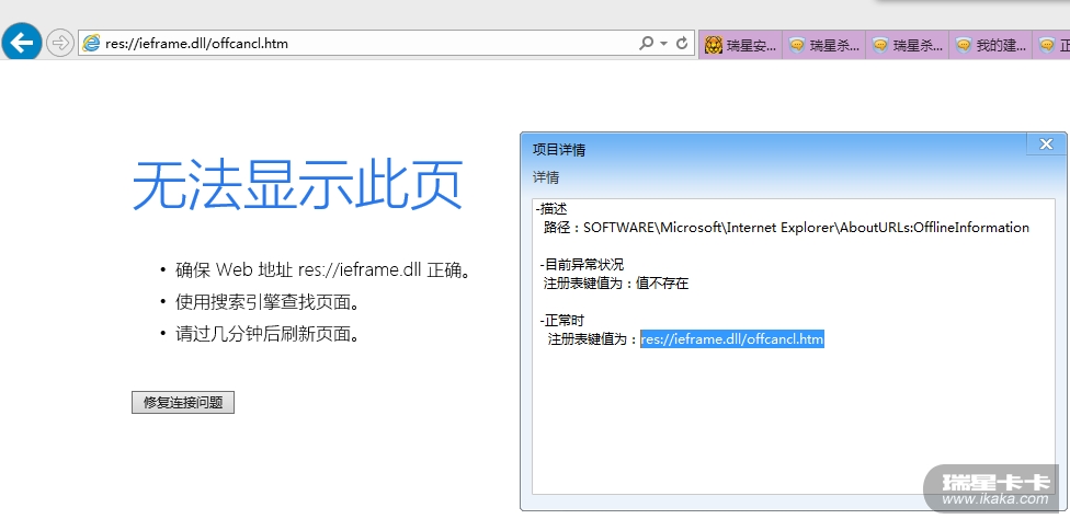 ②About Urls异常,瑞星的建议修复和实际情况是这样的: