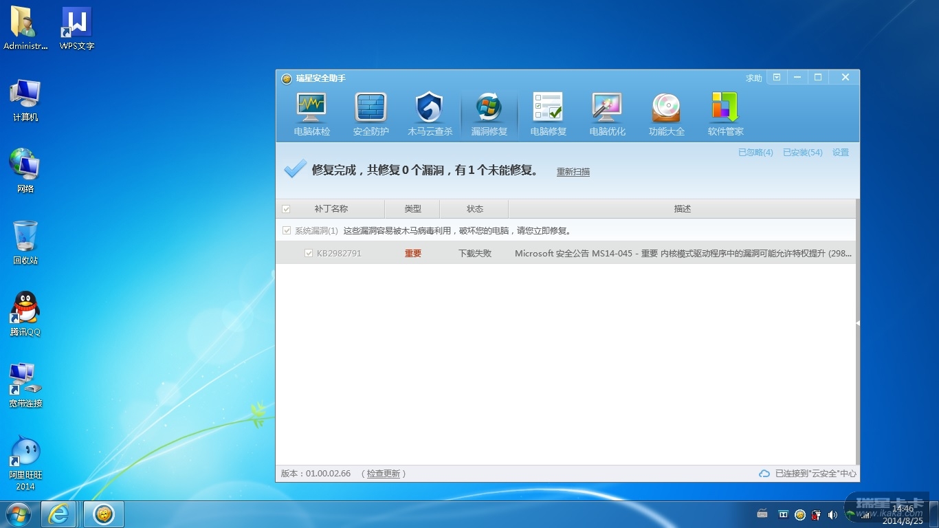 系统win7旗舰版,64位,瑞星安全助手01.00.02.66,