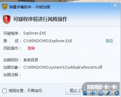 每次打开explorer,瑞星就会提示我说explorer试图删除C:\windows\system32\wbbak目录下的某个DLL或者是创建C:\windows\system32\wbbak目录下的一个DLL,DLL的名字是随机的。似乎瑞星就在不停的创建或删除随机的DLL文件,文件是打开的,进程浏览器看到打开它的进程是explorer.exe,看它的属性描述,是瑞星的”Web Browser Shield Module“。请问这是神马情况,这些DLL是瑞星的吗?瑞星干嘛这样,什么原理?