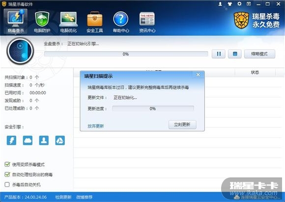 为什么我刚下的V16+更新不了病毒库?点击首页上方提示的立即更新没有任何反应,点击全盘杀毒进入杀毒页面后,就提示更新病毒库,点击立刻更新后,看卡在正在初始化不动了,如下图