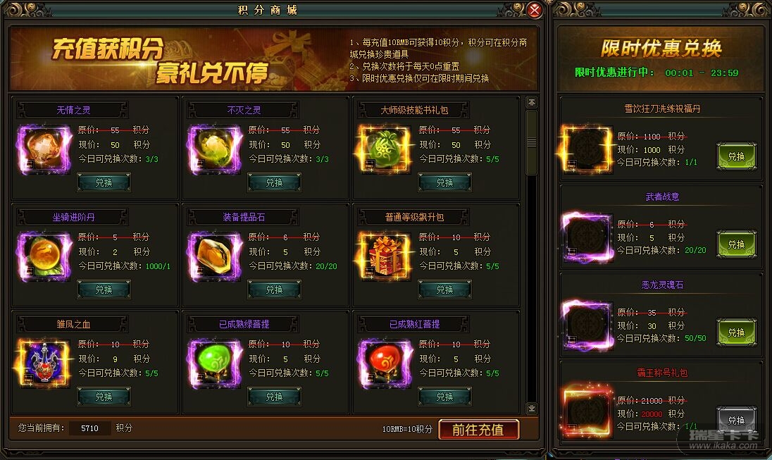玩家每进行充值10RMB就会获得10积分,积分可在积分商城处兑换道具,更有限时优惠兑换,会上架一些超值的道具供玩家限时兑换