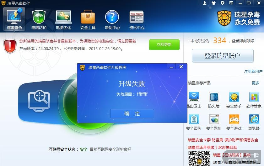 [经验分享] 瑞星软件修复后无法升级也不能卸载,升级提示错误fffff