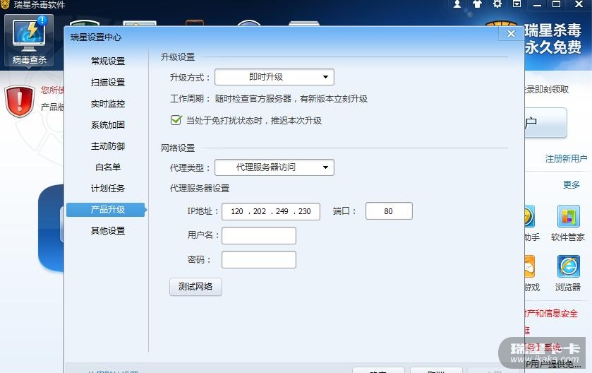2、看过一篇尝试解决的帖子,修改了瑞星设置中心--产品升级IP如下: