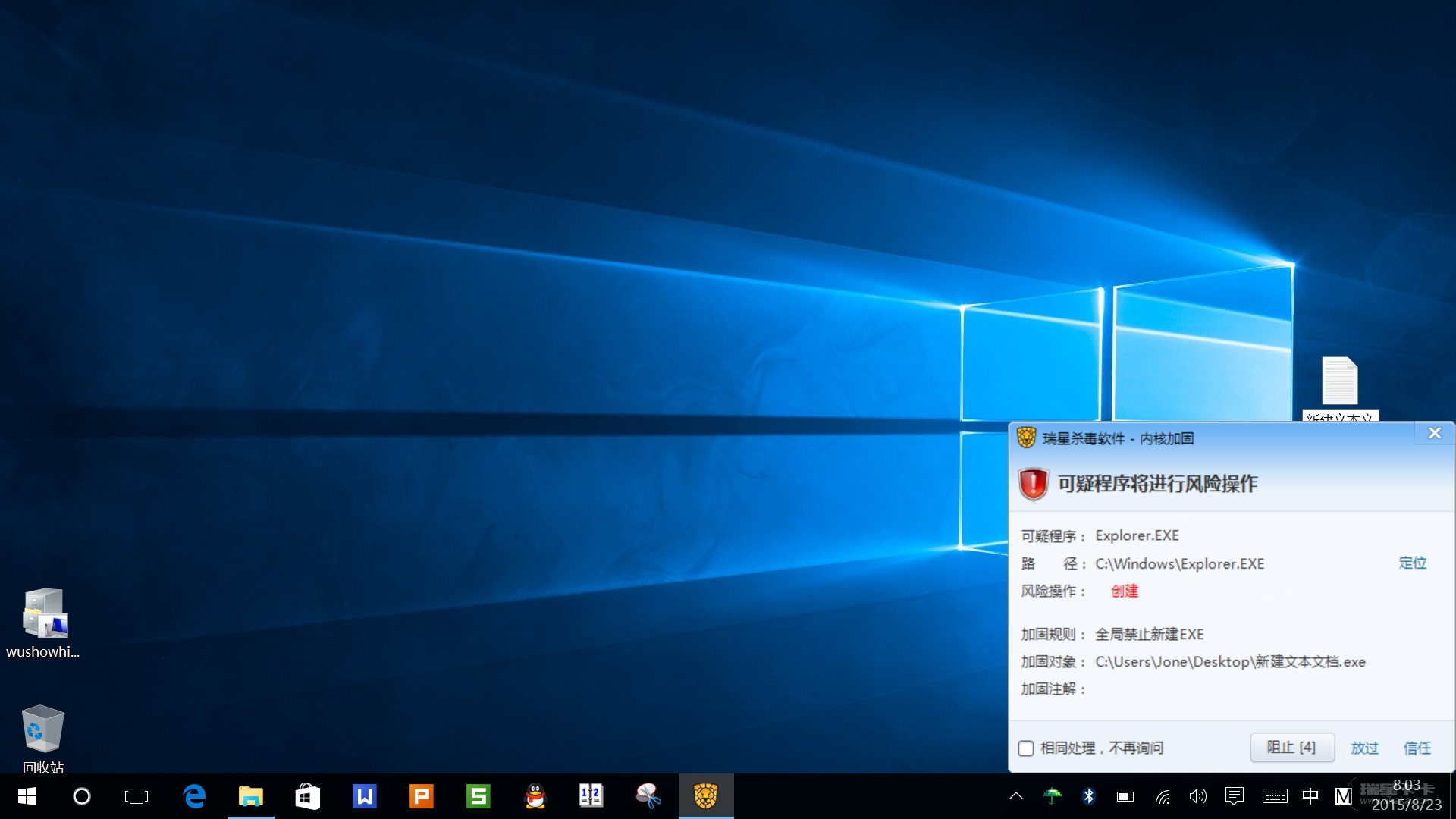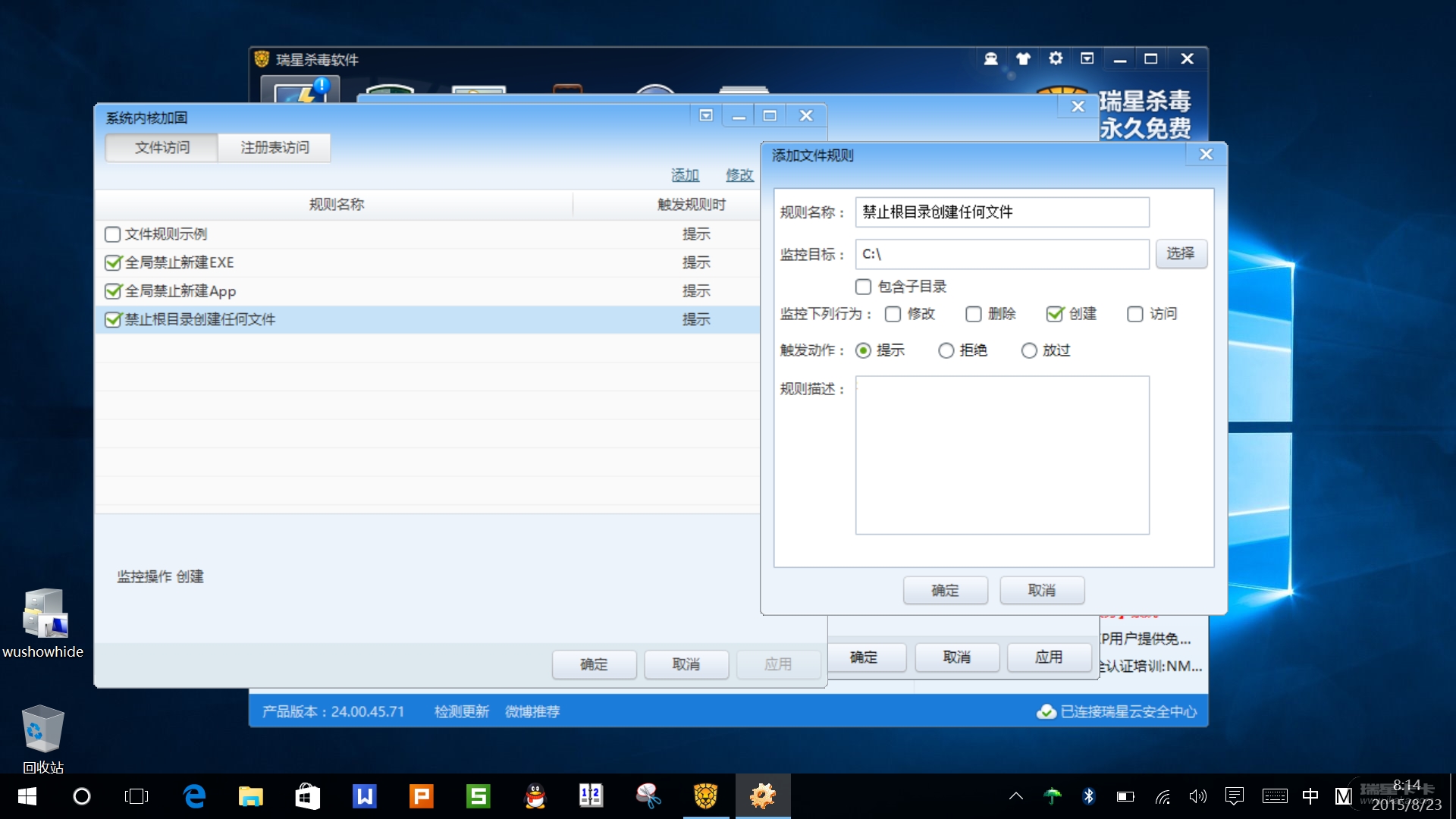 测试时在桌面新建记事本,然后复制到C区根目录,复制成功,而瑞星无任何提示。