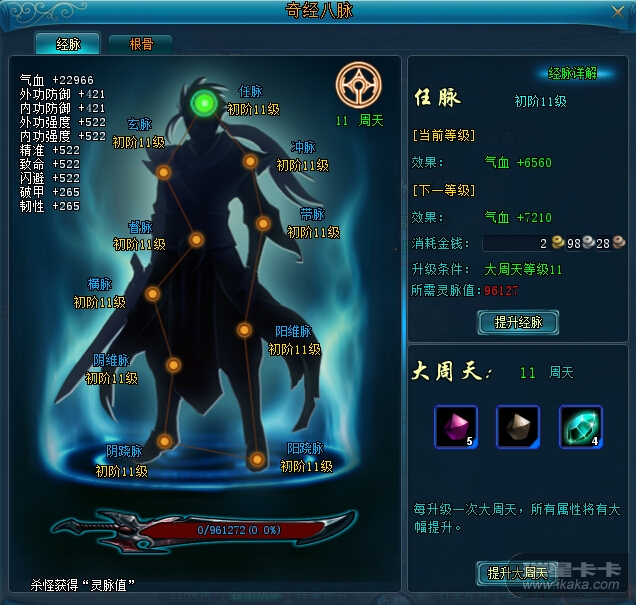 升级经脉除了灵脉值以外,还需要金钱(金钱会根据经脉等级决定),当所有的经脉升级了,同时灵脉值满了后就可以升级大周天了(灵脉值满了后会有特效表示)