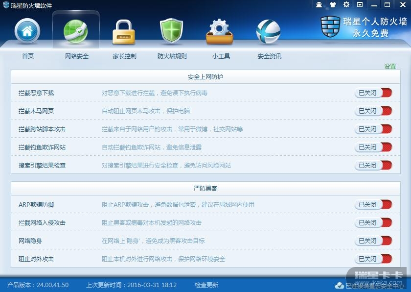 瑞星防火墙拦截四个选项全是已关闭无法正常打开