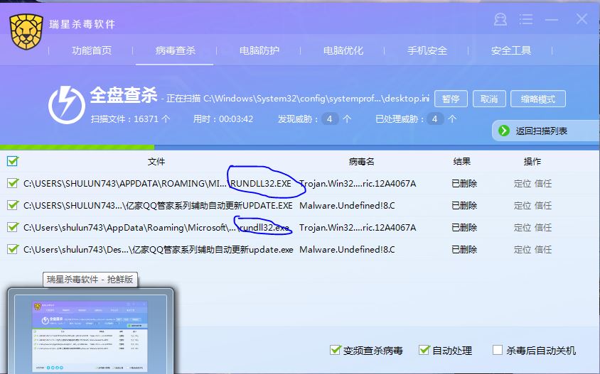 在看看 瑞星的 ,也是 同时 发现了 病毒进程 和 病毒文件 ,但是 是 一起显示的 ,  太不人道了!!!
