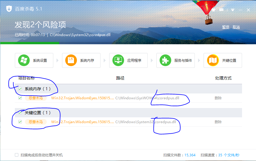看看 百度的 ,同时 发现了 病毒进程 和 病毒 文件 ,但是 人家 分开显示了!!!