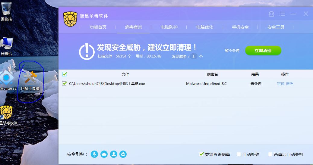 2、使用 右键 扫描 总是发现病毒, 无法 彻底清理干净!!!提示清除成功,但是 样本还是在桌面上,没有被处理掉啊?