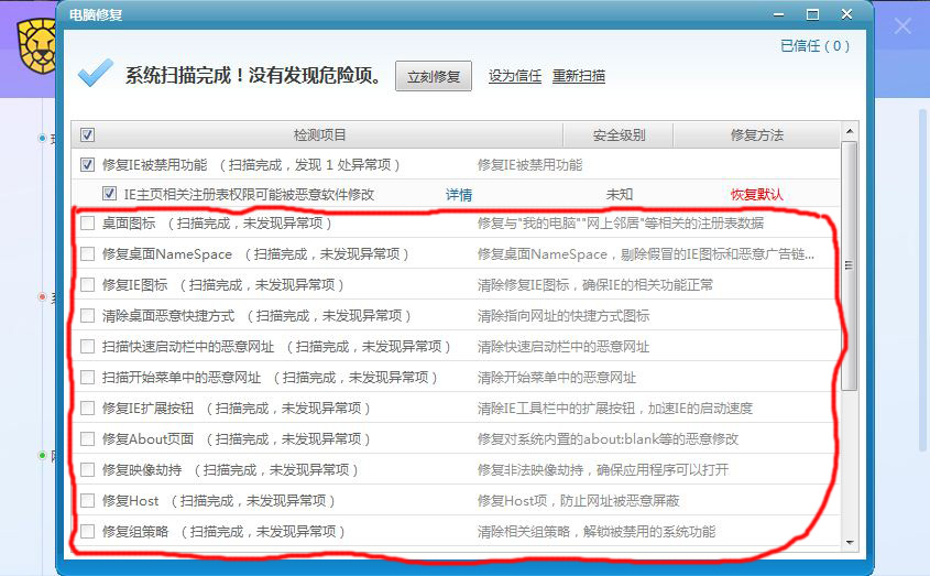 选中“修复IE被禁用功能”,点击立刻修复,没有反应还是下次扫描还会提示?