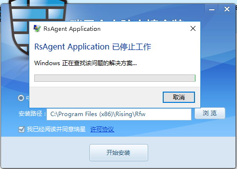 安装瑞星最新版本的ravv17std 瑞星杀毒软件完成后,立即出现报错提示窗。