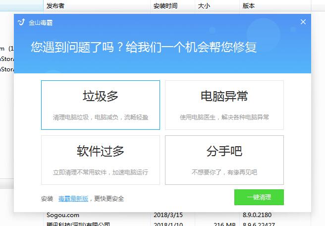 点击卸载程序时, 金山为了留住用户提供了 ,关闭 毒霸 冗余功能的程序