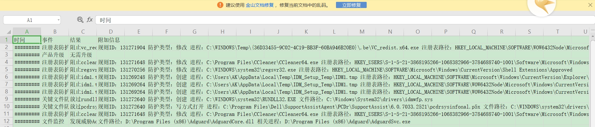 下图把日志格式改成了csv,安全云终端导出过是csv格式的。这回WPS不报错了,但是也不分列了。所以这格式究竟是什么样的格式呢?希望能解决一下