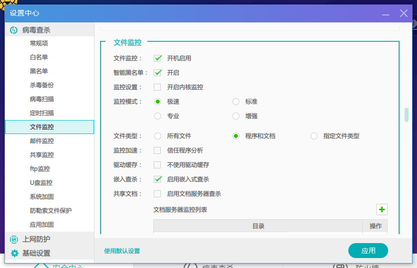 内核监控:增大监控文件动作的范围,但相对来说会增加系统性能消耗,易造成软件冲突,非必要情况下无需开启。