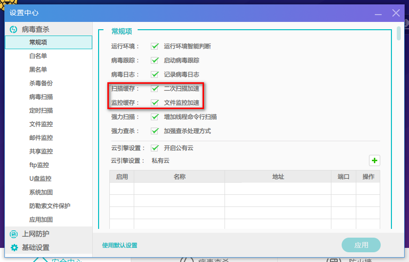 监控加速/驱动缓存:此两项均为节省系统损耗,类似扫描文件缓存。