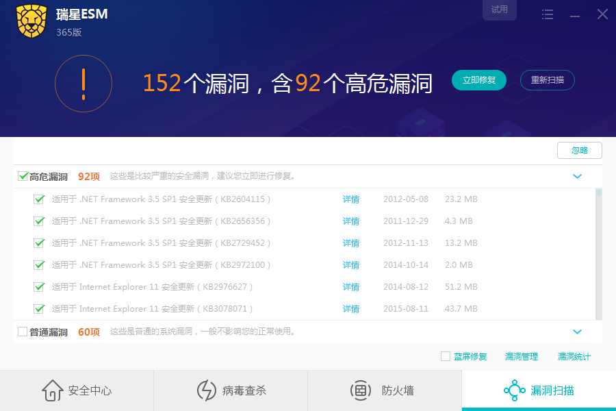 ESM365客户端无法修复漏洞,是不是就是不能修复漏洞?办公的外网电脑,win7的64位系统。换成手机共享wifi的网络,也不能修复,可以扫描出漏洞,但不能修复,见图。