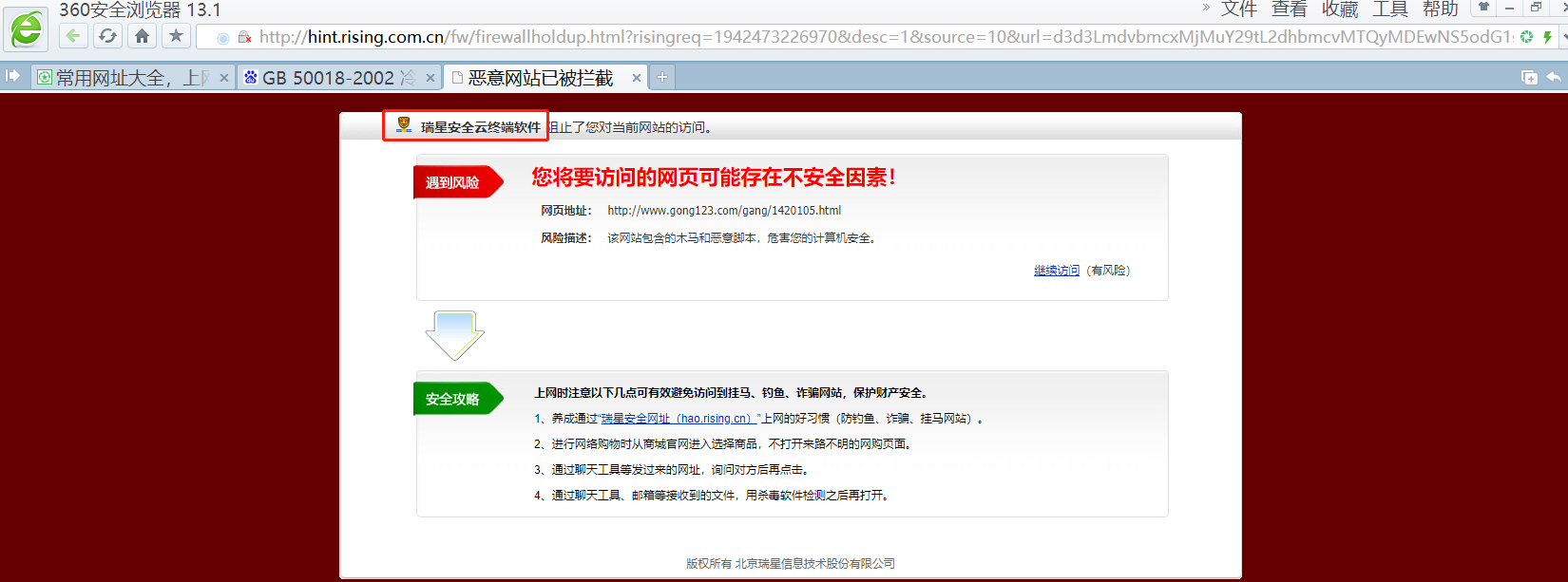 恶意网站拦截显示的却是 安全云终端(这跟系统没啥关系,系统版本号忽略了