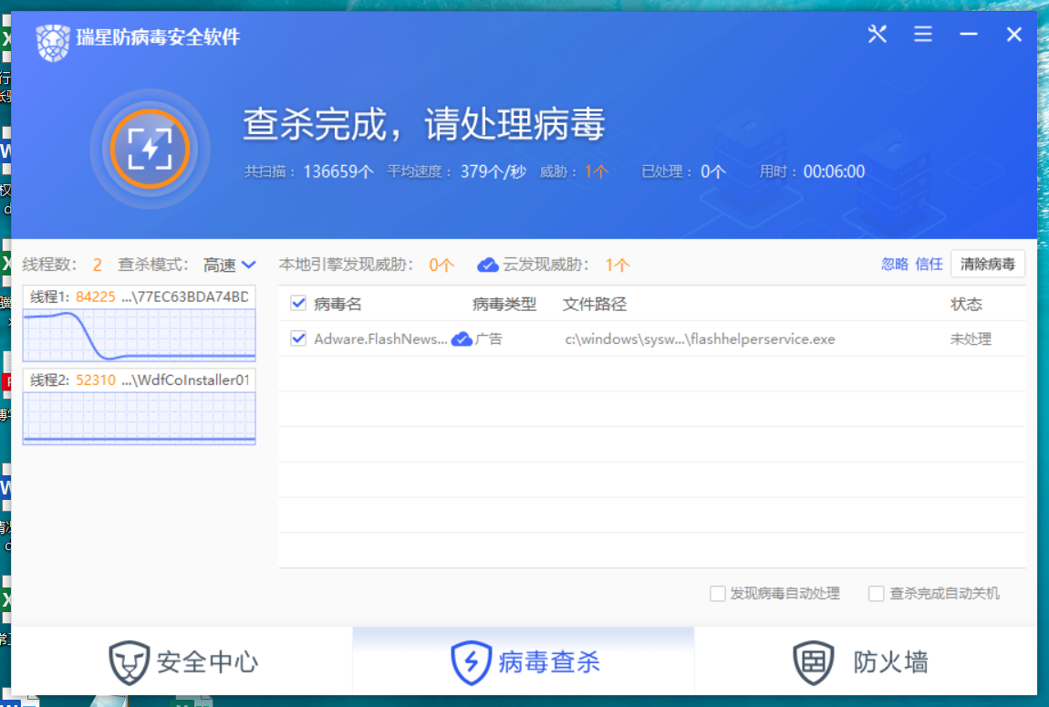 第一步点击快速查杀,并扫出病毒,等待扫描结束。参考下图