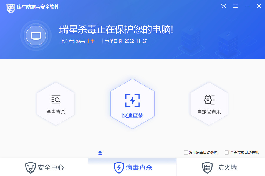 系统托盘退出后,点击桌面图标重启安全软件。进入病毒查杀界面